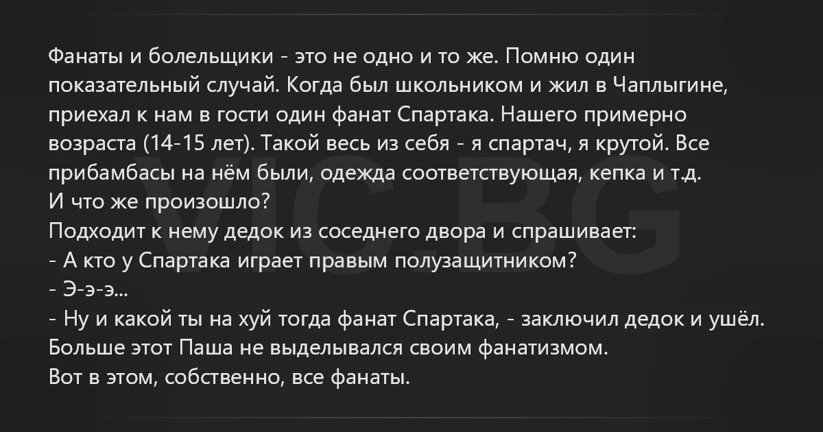 - Ну и какой ты на хуй тогда фанат Спартака, - заключил дедок и ушёл.