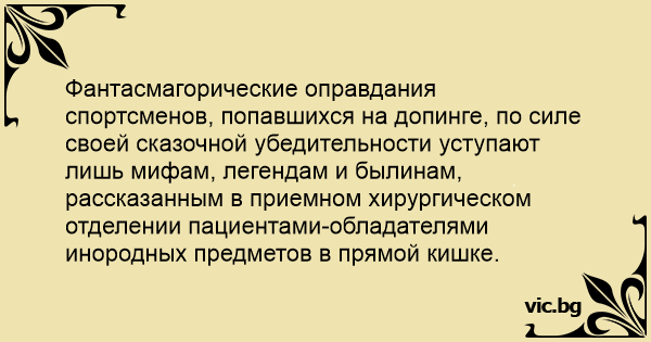Фантасмагорические оправдания спортсменов, попавшихся на допинге, по силе своей сказочной убедительности уступают лишь мифам, легендам и былинам, рассказанным в приемном хирургическом отделении пациентами-обладателями инородных предметов в прямой кишке.