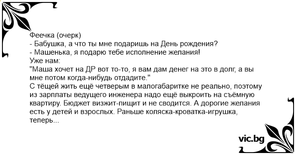 Феечка (очерк) - Бабушка, а что ты мне подаришь на День рождения? - Машенька, я подарю тебе исполнение желания! Уже нам:
