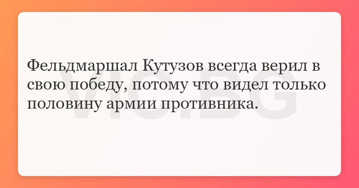 Фельдмаршал Кутузов всегда верил в свою победу, потому что видел только половину армии противника. 20 0 0 Анекдоты