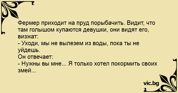Фермер приходит на пруд порыбачить. Видит, что там голышом купаются девушки, они видят его, визжат: