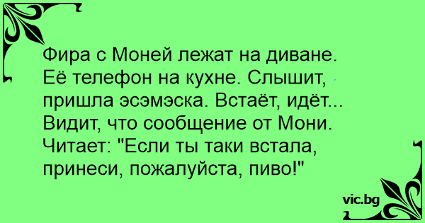 Её телефон на кухне. Слышит, пришла эсэмэска. Встаёт, идёт... Видит, что сообщение от Мони. Читает: "Если ты таки встала, принеси, пожалуйста, пиво!"