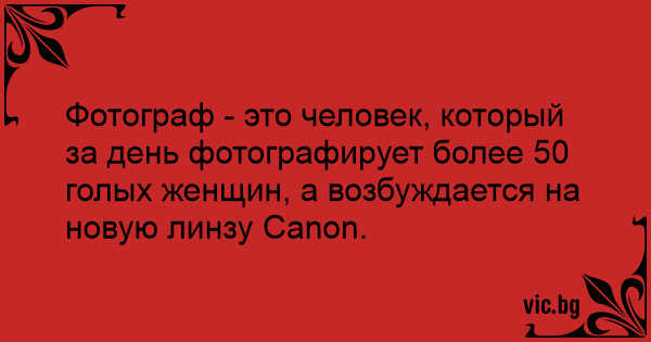 Фотограф - это человек, который за день фотографирует более 50 голых женщин, а возбуждается на новую линзу Саnоn.