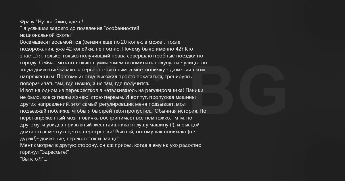 Фразу "Ну вы, блин, даете! " я услышал задолго до появления "особенностей национальной охоты". Восемьдесят восьмой год (бензин еще по 20 копек, а может, после подорожания, уже 42 копейки, не помню. Почему было именно 42? Кто знает...) я, только-только получивший права совершаю пробные поездки по городу. Сейчас можно только с умилением вспоминать полупустые улицы, но тогда движение казалось серьезно-плотным, а мне, новичку - даже слишком напряженным. Поэтому иногда выезжал просто покататься, тренируясь поворачивать там, где нужно, а не там, где получится. И вот на одном из перекрестков я наталкиваюсь на регулировщика! Паники не было, все сигналы я знаю, стою первым. И вот тут, пропуская машины других направлений, этот самый регулировщик меня подзывает, мол, подъезжай поближе, чтобы я быстрей тебя пропустил... Обычная история. Но перенапряженный мозг новичка воспринимает все немножко, гм-м, по другому, и увидев призывный жест гаишника я глушу машину (!), и рысцой двигаюсь к менту в центр перекрестка! Рысцой, потому как понимаю (не дурак!)- движение, перекресток и вааще! Мент смотрел в другую сторону, он аж присел, когда я ему на ухо радостно гаркнул "Здрассьте!" "Вы кто?!" "Я во-о-о-н из тех Жигулей..." "А чего вы ко мне пришли?!" "Так вы ж меня сами позвали!" "Я?! Когда?" "Ну... вы ж показали, "иди сюда"!" У него опустились руки, он помолчал, и обреченно пробормотал: - Ну вы, блин, даете!