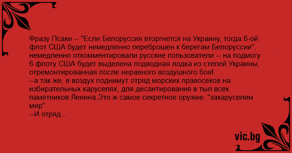 Фразу Псаки -- "Если Белоруссия вторгнется на Украину, тогда 6-ой флот США будет немедленно переброшен к берегам Белоруссии", немедленно откомментировали русские пользователи -- на подмогу 6 флоту США будет выделена подводная лодка из степей Украины, отремонтированная после неравного воздушного боя!