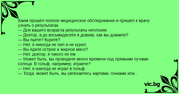 Хаим прошёл полное медицинское обследование и пришёл к врачу узнать о результатах.