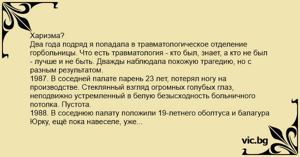 1987. В соседней палате парень 23 лет, потерял ногу на производстве. Стеклянный взгляд огромных голубых глаз, неподвижно устремленный в белую безысходность больничного потолка. Пустота.