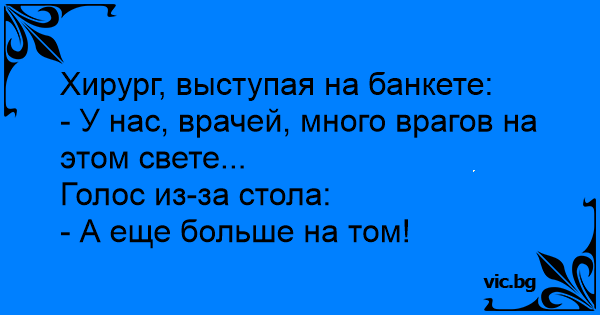 Szpital. Oddział chirurgiczny. Głos z dyżurki lekarskiej: - My chirurdzy to mamy wielu nieprzyjaciół na tym świecie. - A na tamtym jeszcze więcej. - odpowiada słaby głos z sali pooperacyjnej.