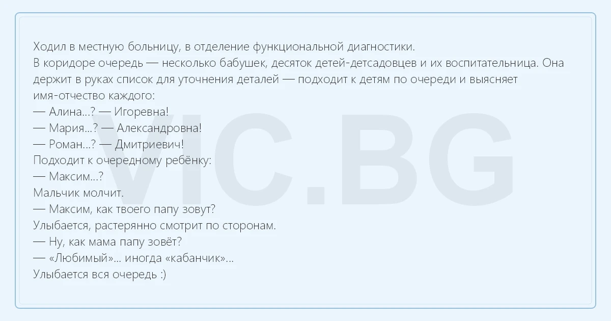 Ходил в местную больницу, в отделение функциональной диагностики. В коридоре очередь — несколько бабушек, десяток детей-детсадовцев и их воспитательница. Она держит в руках список для уточнения деталей — подходит к детям по очереди и выясняет имя-отчество каждого: — Алина...? — Игоревна! — Мария...? — Александровна! — Роман...? — Дмитриевич! Подходит к очередному ребёнку: — Максим...? Мальчик молчит. — Максим, как твоего папу зовут? Улыбается, растерянно смотрит по сторонам. — Ну, как мама папу зовёт? — «Любимый»... иногда «кабанчик»... Улыбается вся очередь :)