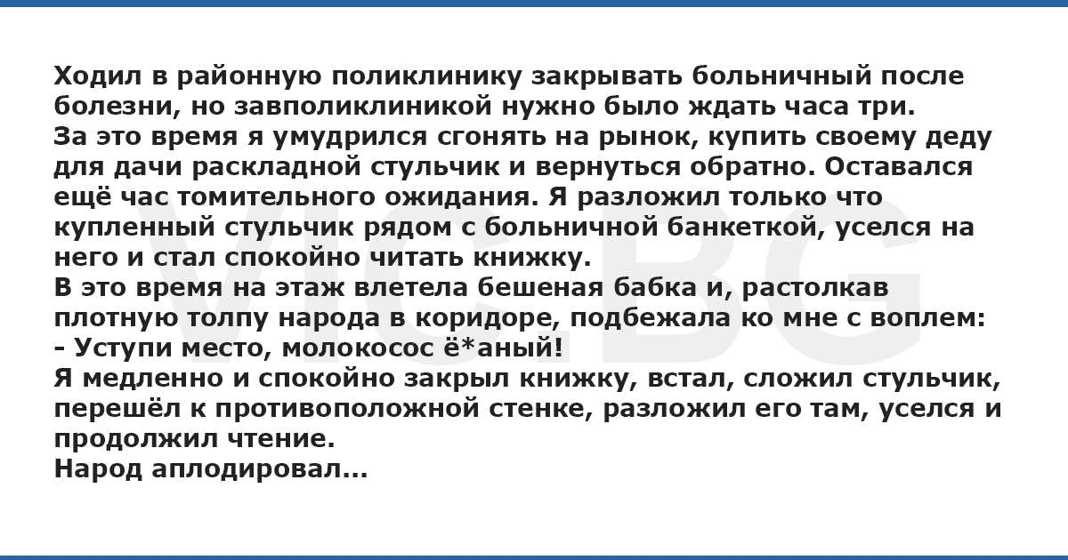 Ходил в районную поликлинику закрывать больничный после болезни, но завполиклиникой нужно было ждать часа три. За это время я умудрился сгонять на рынок, купить своему деду для дачи раскладной стульчик и вернуться обратно. Оставался ещё час томительного ожидания. Я разложил только что купленный стульчик рядом с больничной банкеткой, уселся на него и стал спокойно читать книжку. В это время на этаж влетела бешеная бабка и, растолкав плотную толпу народа в коридоре, подбежала ко мне с воплем: - Уступи место, молокосос ё*аный! Я медленно и спокойно закрыл книжку, встал, сложил стульчик, перешёл к противоположной стенке, разложил его там, уселся и продолжил чтение. Народ аплодировал...