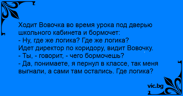 Вовочка идет по коридору школы и говорит: - Не вижу логики, нет я совершенно не вижу логики. Как это, нет логики тут нет. На встречу директор: - Вовочка что случилось. Вовочка: - Я нап%рдел в классе, меня выгнали, они остались нюхать, не вижу логики.
