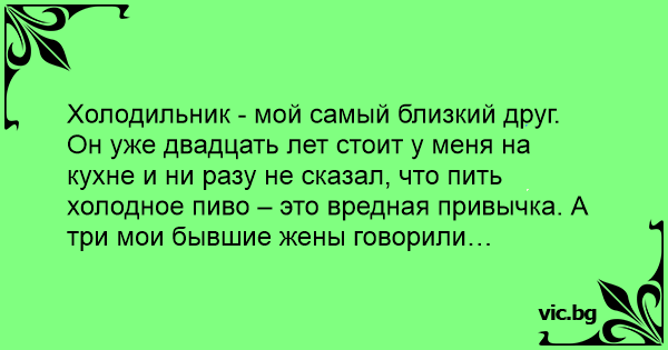 Он уже двадцать лет стоит у меня на кухне и ни разу не сказал, что пить холодное пиво – это вредная привычка. А три мои бывшие жены говорили…