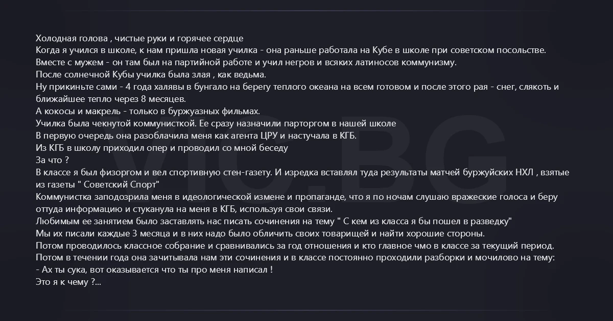 Холодная голова , чистые руки и горячее сердце Когда я учился в школе, к нам пришла новая училка - она раньше работала на Кубе в школе при советском посольстве. Вместе с мужем - он там был на партийной работе и учил негров и всяких латиносов коммунизму. После солнечной Кубы училка была злая , как ведьма. Ну прикиньте сами - 4 года халявы в бунгало на берегу теплого океана на всем готовом и после этого рая - снег, слякоть и ближайшее тепло через 8 месяцев. А кокосы и макрель - только в буржуазных фильмах. Училка была чекнутой коммунисткой. Ее сразу назначили парторгом в нашей школе В первую очередь она разоблачила меня как агента ЦРУ и настучала в КГБ. Из КГБ в школу приходил опер и проводил со мной беседу За что ? В классе я был физоргом и вел спортивную стен-газету. И изредка вставлял туда результаты матчей буржуйских НХЛ , взятые из газеты " Советский Спорт" Коммунистка заподозрила меня в идеологической измене и пропаганде, что я по ночам слушаю вражеские голоса и беру оттуда информацию и стуканула на меня в КГБ, используя свои связи. Любимым ее занятием было заставлять нас писать сочинения на тему " С кем из класса я бы пошел в разведку" Мы их писали каждые 3 месяца и в них надо было обличить своих товарищей и найти хорошие стороны. Потом проводилось классное собрание и сравнивались за год отношения и кто главное чмо в классе за текущий период. Потом в течении года она зачитывала нам эти сочинения и в классе постоянно проходили разборки и мочилово на тему: - Ах ты cуka, вот оказывается что ты про меня написал ! Это я к чему ? Вот сегодняшняя новость: ----------------------- За верную службу наградили пентхаусом в 580 «квадратов» СМИ оценили шикарную недвижимость главы Службы внешней разведки РФ Портал Sobesednik.ru пересчитал шикарную недвижимость семьи главы Службы внешней разведки РФ, экс-премьера Михаила Фрадкова. По данным издания, главный разведчик страны свой шестикомнатный 588-метровый пентхаус в Малом Новопесковском переулке у Британского посольства в Москве получил бесплатно. Таким образом в 2009 году управление делами президента России наградило Фрадкова за хорошую службу. Тогда на расквартирование разведчика страна потратила около 350 млн рублей. Сейчас квадратный метр в его доме стоит 1-2 млн рублей, то есть стоимость пентхауса приближается к миллиарду. Одна из его прежних квартир (на улице Рочдельской у Белого дома) так и осталась в госсобственности, а вот другую – в пять комнат у спорткомплекса «Олимпийский» – оформил на себя его сын Петр. Кроме того, у директора СВР в личной собственности оказался еще гектар земли и 300-метровая дача в тщательно охраняемом поселке Управделами президента «Петрово-Дальнее» прямо у слияния Москвы-реки и Истры. А у его супруги – небольшой особнячок на 15 сотках в рублевском ДСК «Весна» поселка Горки-2 стоимостью еще около 100 млн рублей. ------------------- Так вот, если бы мне пришлось сейчас писать это сочинение, то я бы написал, что с Изей Фрадковым я бы в разведку пошел и притащил бы с ним оттуда много разных ништяков, баксов, колбасы и пару квартир за миллиард рублей с видом на британское посольство. Ниче так, хозяйственный мужичок, с таким не пропадешь в разведке.