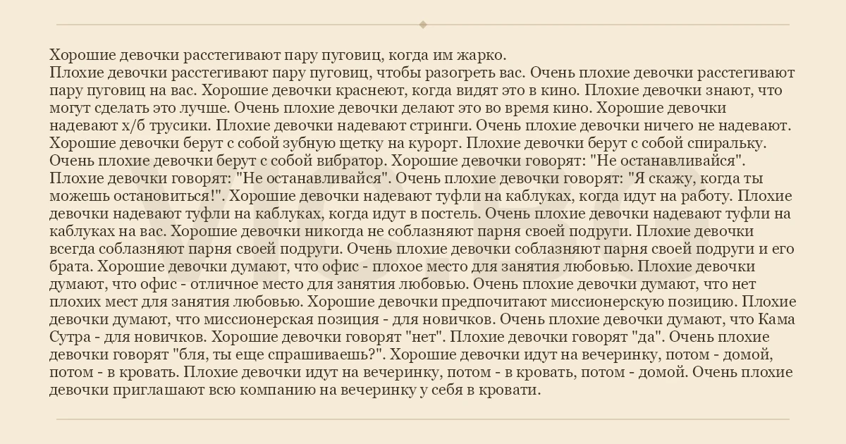 Плохие девочки расстегивают пару пуговиц, чтобы разогреть вас. Очень плохие девочки расстегивают пару пуговиц на вас. Хорошие девочки краснеют, когда видят это в кино. Плохие девочки знают, что могут сделать это лучше. Очень плохие девочки делают это во время кино. Хорошие девочки надевают х/б трусики. Плохие девочки надевают стринги. Очень плохие девочки ничего не надевают. Хорошие девочки берут с собой зубную щетку на курорт. Плохие девочки берут с собой спиральку. Очень плохие девочки берут с собой bибpatop. Хорошие девочки говорят: "Не останавливайся". Плохие девочки говорят: "Не останавливайся". Очень плохие девочки говорят: "Я скажу, когда ты можешь остановиться!". Хорошие девочки надевают туфли на каблуках, когда идут на работу. Плохие девочки надевают туфли на каблуках, когда идут в постель. Очень плохие девочки надевают туфли на каблуках на вас. Хорошие девочки никогда не соблазняют парня своей подруги. Плохие девочки всегда соблазняют парня своей подруги. Очень плохие девочки соблазняют парня своей подруги и его брата. Хорошие девочки думают, что офис - плохое место для занятия любовью. Плохие девочки думают, что офис - отличное место для занятия любовью. Очень плохие девочки думают, что нет плохих мест для занятия любовью. Хорошие девочки предпочитают миссионерскую позицию. Плохие девочки думают, что миссионерская позиция - для новичков. Очень плохие девочки думают, что Кама Сутра - для новичков. Хорошие девочки говорят "нет". Плохие девочки говорят "да". Очень плохие девочки говорят "бля, ты еще спрашиваешь?". Хорошие девочки идут на вечеринку, потом - домой, потом - в кровать. Плохие девочки идут на вечеринку, потом - в кровать, потом - домой. Очень плохие девочки приглашают всю компанию на вечеринку у себя в кровати.