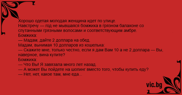 — Скажите мне, только честно, если я дам Вам 10 а не 2 доллара — Вы, наверное, вина купите?