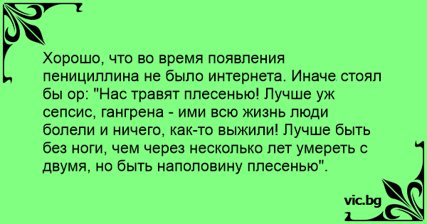 Хорошо, что во время появления пенициллина не было интернета. Иначе стоял бы ор: "Нас травят плесенью! Лучше уж сепсис, гангрена - ими всю жизнь люди болели и ничего, как-то выжили! Лучше быть без ноги, чем через несколько лет умереть с двумя, но быть наполовину плесенью".