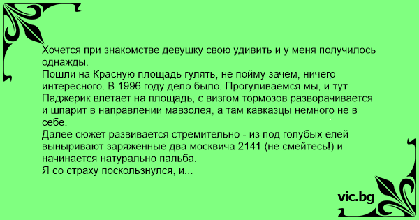 Хочется при знакомстве девушку свою удивить и у меня получилось однажды. Пошли на Красную площадь гулять, не пойму зачем, ничего интересного. В 1996 году дело было. Прогуливаемся мы, и тут Паджерик влетает на площадь, с визгом тормозов разворачивается и шпарит в направлении мавзолея, а там кавказцы немного не в себе. Далее сюжет развивается стремительно - из под голубых елей выныривают заряженные два москвича 2141 (не смейтесь!) и начинается натурально пальба. Я со страху поскользнулся, и девушку своим телом накрыл. Лежим, стрельба стихла. Москвичи прижали Крузак у переулка и джигитов вытащили мордой в брусчатку. Девушка поднялась с земли раньше меня. Отряхивается и говорит: - Ну ты крут! Это вас в горячей точке так учили? Я сам немного в ахуе, но отвечаю: - За меня держись, целее будешь. - Это всё хорошо, только ты в другой раз так падай, чтобы я сверху. Вот и пойми этих женщин.