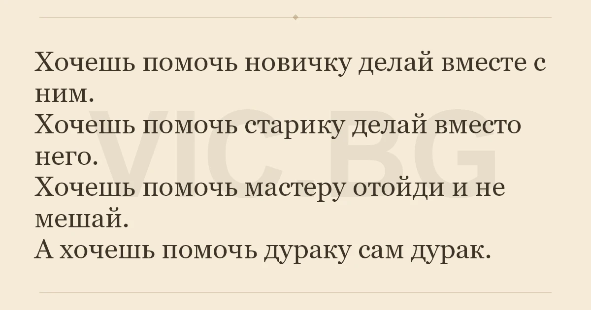 Хочешь помочь новичку делай вместе с ним.<br />Хочешь помочь старику делай вместо него. <br />Хочешь помочь мастеру отойди и не мешай. <br />А хочешь помочь дураку сам дуpak.