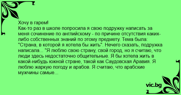 Хочу в гарем! Как-то раз в школе попросила я свою подружку написать за меня сочинение по английскому - по причине отсутствия каких-либо собственных знаний по этому предмету. Тема была: