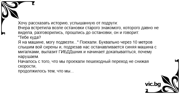 Хочу рассказать историю, услышанную от подруги: Вчера встретила возле остановки старого знакомого, которого давно не видела, разговорились, прошлись до остановки, он и говорит: