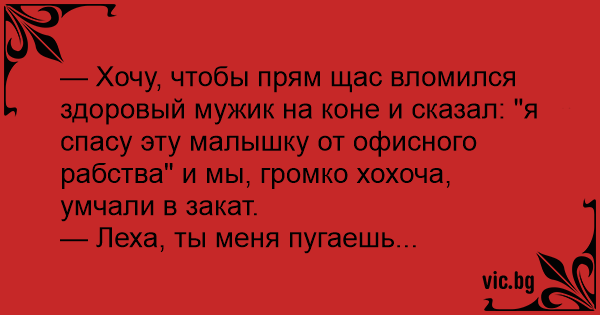 — Хочу, чтобы прям щас вломился здоровый мужик на коне и сказал: "я спасу эту малышку от офисного рабства" и мы, громко хохоча, умчали в закат.<br />— Леха, ты меня пугаешь...