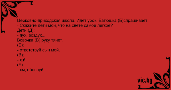 Церковно-приходская школа. Идет урок. Батюшка (Б)спрашивает: