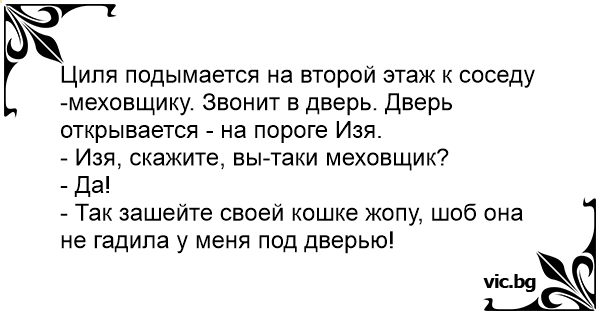 - Так зашейте своей кошке жопу, шоб она не гадила у меня под дверью!