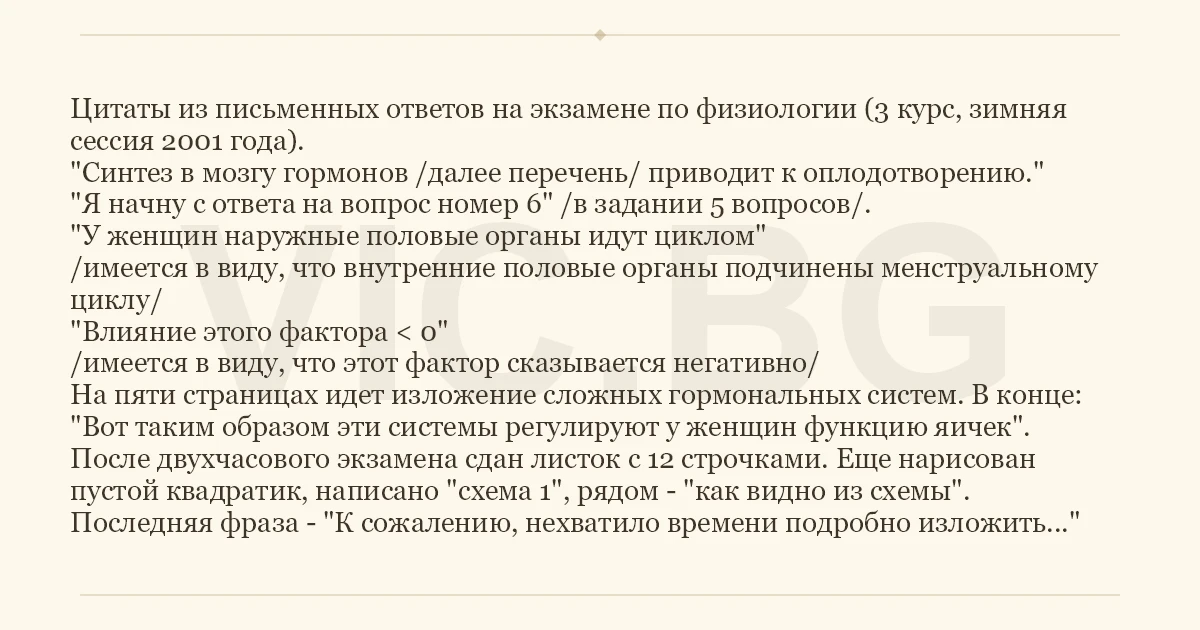 Цитаты из письменных ответов на экзамене по физиологии (3 курс, зимняя сессия 2001 года). "Синтез в мозгу гормонов /далее перечень/ приводит к оплодотворению." "Я начну с ответа на вопрос номер 6" /в задании 5 вопросов/. "У женщин наружные половые органы идут циклом" /имеется в виду, что внутренние половые органы подчинены менструальному циклу/ "Влияние этого фактора < 0" /имеется в виду, что этот фактор сказывается негативно/ На пяти страницах идет изложение сложных гормональных систем. В конце: "Вот таким образом эти системы регулируют у женщин функцию яичек". После двухчасового экзамена сдан листок с 12 строчками. Еще нарисован пустой квадратик, написано "схема 1", рядом - "как видно из схемы". Последняя фраза - "К сожалению, нехватило времени подробно изложить..."