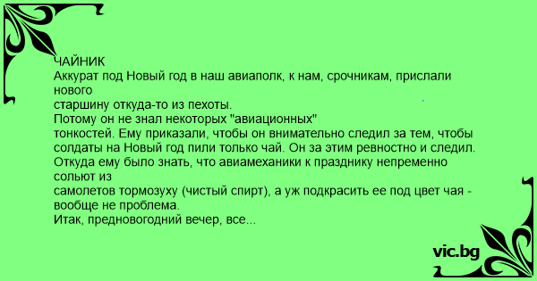 старшину откуда-то из пехоты. Потому он не знал некоторых "авиационных" тонкостей. Ему приказали, чтобы он внимательно следил за тем, чтобы солдаты на Новый год пили только чай. Он за этим ревностно и следил. Откуда ему было знать, что авиамеханики к празднику непременно сольют из самолетов тормозуху (чистый спирт), а уж подкрасить ее под цвет чая - вообще не проблема. Итак, предновогодний вечер, все солдаты в столовой тихо-мирно пьют чай с леденцами, разливая его из чайников, и постепенно напиваются вдрызг. Молодой старшина долго непонимающе хлопал густыми ресницами, наконец схватил со стола один из чайников и сделал оттуда добрый глоток. Поперхнувшись, присел на стульчик и горестно вздохнул: - Я - чайник.