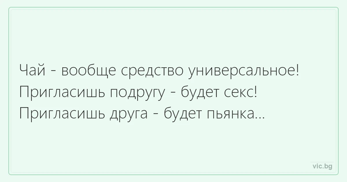 Чай - вообще средство универсальное!<br />Пригласишь подругу - будет cekc!<br />Пригласишь друга - будет пьянка...