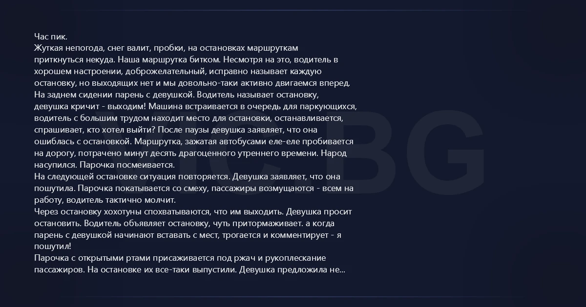 Час пик. Жуткая непогода, снег валит, пробки, на остановках маршруткам приткнуться некуда. Наша маршрутка битком. Несмотря на это, водитель в хорошем настроении, доброжелательный, исправно называет каждую остановку, но выходящих нет и мы довольно-таки активно двигаемся вперед. На заднем сидении парень с девушкой. Водитель называет остановку, девушка кричит - выходим! Машина встраивается в очередь для паркующихся, водитель с большим трудом находит место для остановки, останавливается, спрашивает, кто хотел выйти? После паузы девушка заявляет, что она ошиблась с остановкой. Маршрутка, зажатая автобусами еле-еле пробивается на дорогу, потрачено минут десять драгоценного утреннего времени. Народ насупился. Парочка посмеивается. На следующей остановке ситуация повторяется. Девушка заявляет, что она пошутила. Парочка покатывается со смеху, пассажиры возмущаются - всем на работу, водитель тактично молчит. Через остановку хохотуны спохватываются, что им выходить. Девушка просит остановить. Водитель объявляет остановку, чуть притормаживает. а когда парень с девушкой начинают вставать с мест, трогается и комментирует - я пошутил! Парочка с открытыми ртами присаживается под ржач и рукоплескание пассажиров. На остановке их все-таки выпустили. Девушка предложила не расплачиваться, но парень решил не рисковать, когда наткнулся на неодобрительные взгляды мужиков, сидевших у выхода.