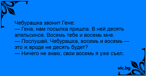 — Гена, нам посылка пришла. В ней десять апельсинов. Восемь тебе и восемь мне.