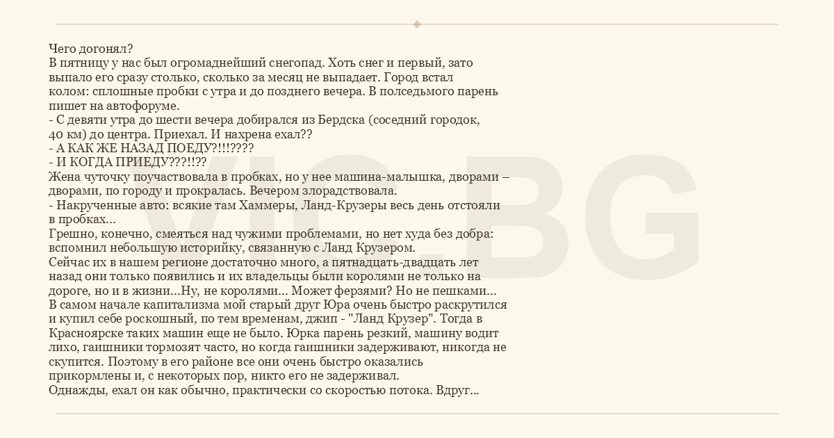 Чего догонял? В пятницу у нас был огромаднейший снегопад. Хоть снег и первый, зато выпало его сразу столько, сколько за месяц не выпадает. Город встал колом: сплошные пробки с утра и до позднего вечера. В полседьмого парень пишет на автофоруме. - С девяти утра до шести вечера добирался из Бердска (соседний городок, 40 км) до центра. Приехал. И нахрена ехал?? - А КАК ЖЕ НАЗАД ПОЕДУ?!!!???? - И КОГДА ПРИЕДУ???!!?? Жена чуточку поучаствовала в пробках, но у нее машина-малышка, дворами – дворами, по городу и прокралась. Вечером злорадствовала. - Накрученные авто: всякие там Хаммеры, Ланд-Крузеры весь день отстояли в пробках... Грешно, конечно, смеяться над чужими проблемами, но нет худа без добра: вспомнил небольшую историйку, связанную с Ланд Крузером. Сейчас их в нашем регионе достаточно много, а пятнадцать-двадцать лет назад они только появились и их владельцы были королями не только на дороге, но и в жизни...Ну, не королями... Может ферзями? Но не пешками... В самом начале капитализма мой старый друг Юра очень быстро раскрутился и купил себе роскошный, по тем временам, джип - "Ланд Крузер". Тогда в Красноярске таких машин еще не было. Юрка парень резкий, машину водит лихо, гаишники тормозят часто, но когда гаишники задерживают, никогда не скупится. Поэтому в его районе все они очень быстро оказались прикормлены и, с некоторых пор, никто его не задерживал. Однажды, ехал он как обычно, практически со скоростью потока. Вдруг обнаружил сзади за собой погоню. Машина с мигалкой! Милицейская машина! Юра добавил скорости. Те тоже добавили. Впереди пробка! Юра рванул в обгон колонны по трамвайным путям! Те тоже рвут! Уже и Красноярск кончился, в Академгородок влетают. Тут он решил остановиться, тем более, что уже приехал, куда надо. Выходит из машины, тот тоже выходит. Рожа, хорошо знакомая - Чего догонял? - Да поздороваться хотел, Юрий Иванович...