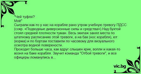Сыграли как-то у нас на корабле рано утром учебную тревогу ПДСС (сокр. «Подводные диверсионные силы и средства»).Над бухтой стоял средней плотности туман. Весь экипаж занял места по штатному расписанию этой тревоги, а на бак (нос корабля), ют (корма) и по бортам поставили по часовому для визуального осмотра водной поверхности.