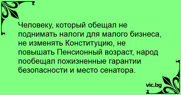 Человеку, который обещал не поднимать налоги для малого бизнеса, не изменять Конституцию, не повышать Пенсионный возраст, народ пообещал пожизненные гарантии безопасности и место сенатора.