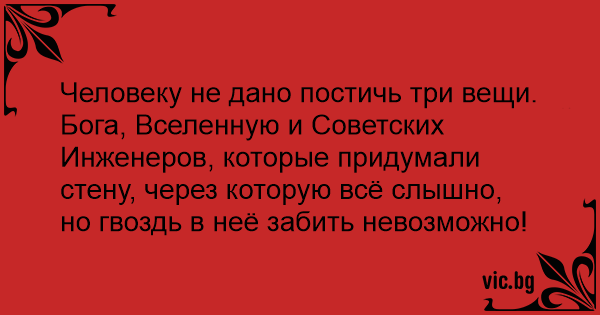 Человеку не дано постичь три вещи. Бога, Вселенную и Советских Инженеров, которые придумали стену, через которую всё слышно, но гвоздь в неё забить невозможно!