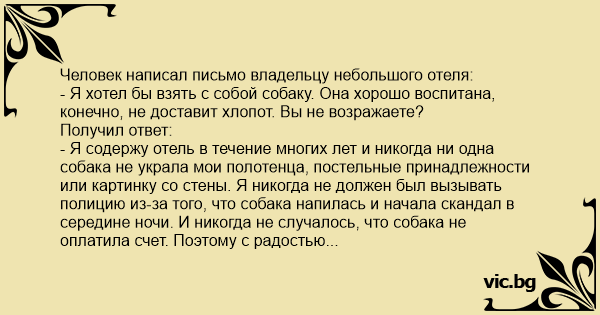 - Я содержу отель в течение многих лет и никогда ни одна собака не украла мои полотенца, постельные принадлежности или картинку со стены. Я никогда не должен был вызывать полицию из-за того, что собака напилась и начала скандал в середине ночи. И никогда не случалось, что собака не оплатила счет. Поэтому с радостью приветствую собаку, и если она поручится за Вас - Вы также можете приехать.