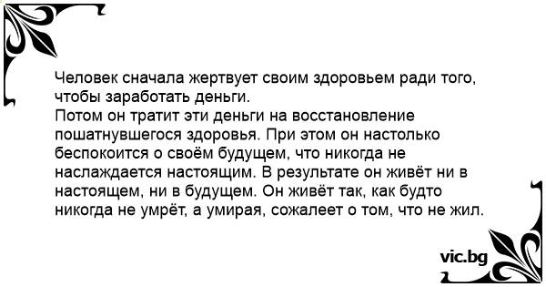 Потом он тратит эти деньги на восстановление пошатнувшегося здоровья. При этом он настолько беспокоится о своём будущем, что никогда не наслаждается настоящим. В результате он живёт ни в настоящем, ни в будущем. Он живёт так, как будто никогда не умрёт, а умирая, сожалеет о том, что не жил.