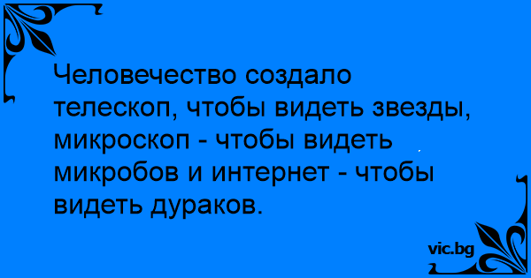 Человечество создало телескоп, чтобы видеть звезды, микроскоп - чтобы видеть микробов и интернет - чтобы видеть дураков.