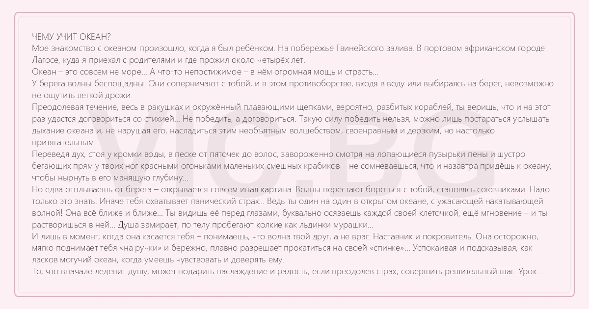 ЧЕМУ УЧИТ ОКЕАН? Моё знакомство с океаном произошло, когда я был ребёнком. На побережье Гвинейского залива. В портовом африканском городе Лагосе, куда я приехал с родителями и где прожил около четырёх лет. Океан – это совсем не море... А что-то непостижимое – в нём огромная мощь и страсть... У берега волны беспощадны. Они соперничают с тобой, и в этом противоборстве, входя в воду или выбираясь на берег, невозможно не ощутить лёгкой дрожи. Преодолевая течение, весь в ракушках и окружённый плавающими щепками, вероятно, разбитых кораблей, ты веришь, что и на этот раз удастся договориться со стихией... Не победить, а договориться. Такую силу победить нельзя, можно лишь постараться услышать дыхание океана и, не нарушая его, насладиться этим необъятным волшебством, своенравным и дерзким, но настолько притягательным. Переведя дух, стоя у кромки воды, в песке от пяточек до волос, завороженно смотря на лопающиеся пузырьки пены и шустро бегающих прям у твоих ног красными огоньками маленьких смешных крабиков – не сомневаешься, что и назавтра придёшь к океану, чтобы нырнуть в его манящую глубину... Но едва отплываешь от берега – открывается совсем иная картина. Волны перестают бороться с тобой, становясь союзниками. Надо только это знать. Иначе тебя охватывает панический страх... Ведь ты один на один в открытом океане, с ужасающей накатывающей волной! Она всё ближе и ближе... Ты видишь её перед глазами, буквально осязаешь каждой своей клеточкой, ещё мгновение – и ты растворишься в ней... Душа замирает, по телу пробегают колкие как льдинки мурашки... И лишь в момент, когда она касается тебя – понимаешь, что волна твой друг, а не враг. Наставник и покровитель. Она осторожно, мягко поднимает тебя «на ручки» и бережно, плавно разрешает прокатиться на своей «спинке»... Успокаивая и подсказывая, как ласков могучий океан, когда умеешь чувствовать и доверять ему. То, что вначале леденит душу, может подарить наслаждение и радость, если преодолев страх, совершить решительный шаг. Урок мудрого величественного Океана, полученный ещё в детстве, я запомнил навсегда! {...Мне было пятнадцать лет. Мы с друзьями шли по летней улице... Играл магнитофон... Солнце плавно садилось в облаках... Мы понимали, что детство заканчивается... Что нас ждёт разлука... И скоро все разъедемся, окончив школу... Но пока – мы были вместе. Полностью доверявшие друг другу... Знавшие все сильные и слабые стороны каждого ещё с детского сада... И принимавшие друг друга такими какие есть... Мы шли по вечерней улице и улыбались... Каждый из нас чувствовал, в какую бы часть света не занесла его судьба, мы навсегда останемся душой друг с другом... И обязательно встретимся. Пусть и спустя годы.} Так и покидая Африку, я не сомневался, что рано или поздно приеду снова. Увижу океан, улыбнусь ему, и он будет для меня таким же притягательным, как в детстве. Если человек немного остаётся в душе ребёнком, не теряет способности удивляться, радоваться мелочам, то и ему самому, и его близким живётся намного проще и веселее. Частичка жаркого африканского солнышка, которая сохранилась в моём сердце с нежного возраста, помогает не унывать в самых запутанных и сложных ситуациях. И у каждого человека должен присутствовать свой лучик солнышка в душе, который будет согревать, дарить надежду и радость, что бы ни случалось в жизни. И какие б