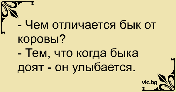 Урок по биология. Учителката пита: - Как да различим кравата от бика? Иванчо отговаря: - Бикът се усмихва когато го доим .