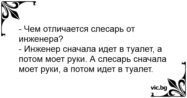 - Инженер сначала идет в туалет, а потом моет руки. А слесарь сначала моет руки, а потом идет в туалет.