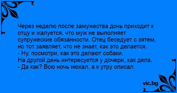 Через неделю после замужества дочь приходит к отцу и жалуется, что муж не выполняет супружеские обязанности. Отец беседует с зятем, но тот заявляет, что не знает, как это делается.