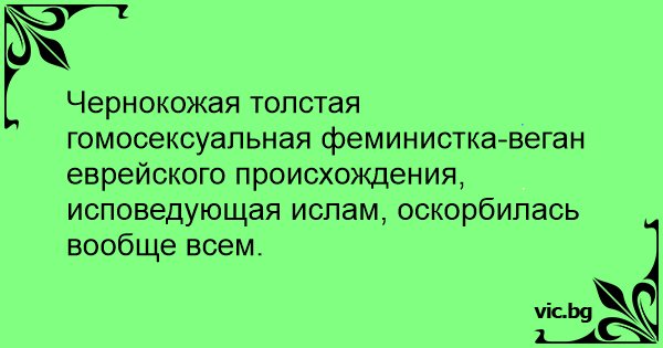 Чернокожая толстая гомосексуальная феминистка-beгaн еврейского происхождения, исповедующая ислам, оскорбилась вообще всем.