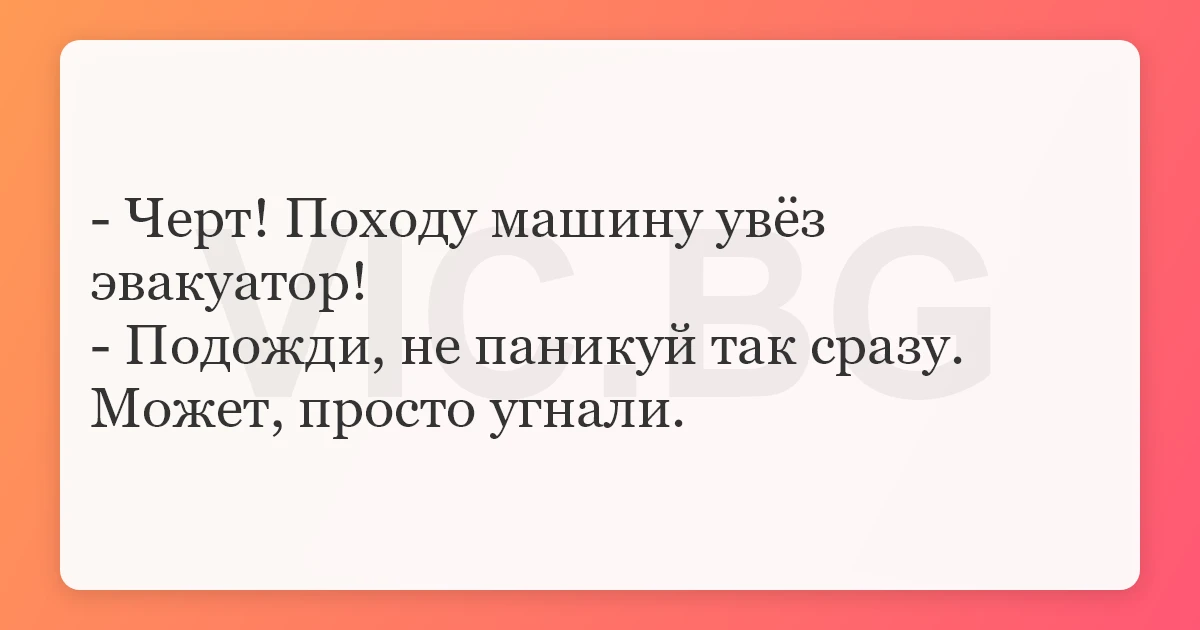- Черт! Походу машину увёз эвакуатор!- Подожди, не паникуй так сразу. Может, просто угнали. 0 0 0 Анекдоты