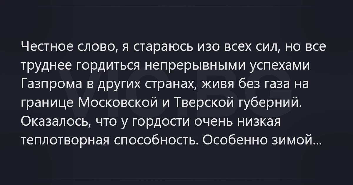 Честное слово, я стараюсь изо всех сил, но все труднее гордиться непрерывными успехами Газпрома в других странах, живя без газа на границе Московской и Тверской губерний. Оказалось, что у гордости очень низкая теплотворная способность. Особенно зимой...