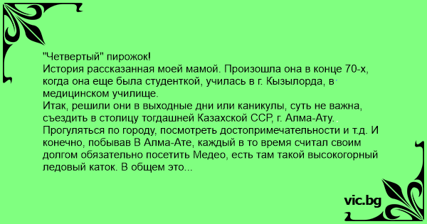 Хорошенько прогулявшись, а с ней было трое сокурсниц (это важно!), они все хорошенько проголодались и решили заморить червячка. Увидев ближайший лоток, где продавались пирожки, торговец был выходцем с Кавказа. И здесь имеется одна изюминка, все четверо девушек были рожденными и всю жизнь прожившими в отдаленных аулах Казахстана, коих не мало в степях Казахстана и там даже не было школы с русским языком обучения и соответственно русский язык они знали, не то что сказать плохо, даже можно сказать практически не владели, кроме... Конечно, моей мамочки, у которой отец, мой дед, был водителем дальнобойщиком и иногда, я повторюсь, ИНОГДА, говорил дома на русском языке. И вот они подойдя к лотку с пирожками, немножко замялись, так как с одной стороны не хотели потерять лицо, а с другой стороны есть уж очень хотелось... И в этот момент всё шефство взяла на себя мама, так как Знала немного русский. Она обратилась к продавцу со словами: