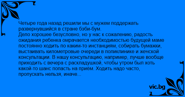 В коридоре повисла МХАТовская пауза. Слышно было, как летает муха. Будущие мамы в ступоре смотрели на юную семью. В конце очереди кто-то сказал: "М-да.. лучше поздно.."