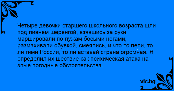 Четыре девочки старшего школьного возраста шли под ливнем шеренгой, взявшись за руки, маршировали по лужам босыми ногами, размахивали обувкой, смеялись, и что-то пели, то ли гимн России, то ли вставай страна огромная. Я определил их шествие как психическая атака на злые погодные обстоятельства.