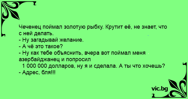 Чеченец поймал золотую рыбку. Крутит её, не знает, что с ней делать.